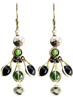 Colorful mix of vintage and new glass beads with Peking jade, pyrite and brass findings on 22K vermeil lever back earring fixtures.
