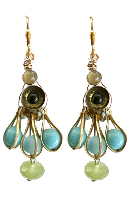Colorful mix of vintage glass with new jade beads with brass findings on 22K vermeil lever back earring fixtures.