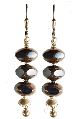 Mod black and gold rondelles dangling atop brass drops on 22K vermeil lever back earring fixtures.
