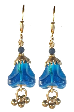 Bright blue glass tulip inspired flower above brass dangles with vermeil leverback earring fixtures (sterling silver dipped closures dipped in 22K gold fill).