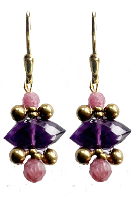 Small jewel touch earring with faceted amethyst and brass ball and ruby accents on 22K vermeil lever back earring fixtures.