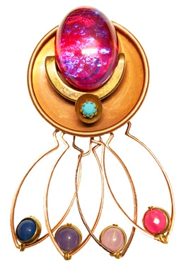 1950's alexandrite glass (fucia with amethyst sparkles) on vintage copper and brass metal fidings with dyed new jade and glass accents. 3"L x 2"W