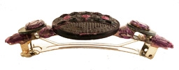 1920's vintage glass hat pin top with '30's & '50's glass accents with mother of pearl rings on a French barrette fixture. 4.5" x 3"W