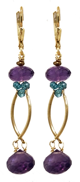 Amethyst drops and rondelles with brass links and teal hydroquartz crystals accents on 22K vermeil lever back earring fixtures. 1.5"L x .33"W