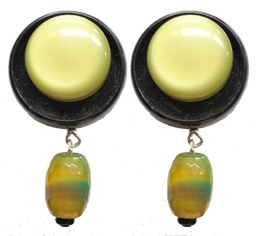 Black base with '60's plastic olive cabouchons with faceted yellow/green dyed onyx drops on clip or post earring backs. Please specify which you prefer. 1.5"L x 1"W