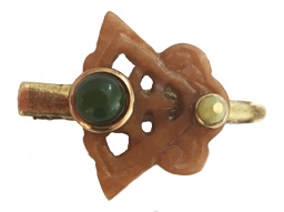 Brown jade carved piece with faceted peking and olive jade beads on an antiqued bronze toothed hair clip to pin up a bit of hair. 1.75" L x 1" W