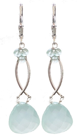 Aqua chalcedony drops with sterling silver links and aqua chalcedony accents on sterling silver lever back earring fixtures. 1.5"L x .33"W