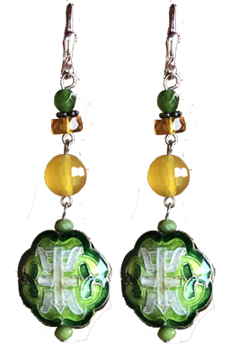 Limited edition Chinese enamel beads mixed with faceted brown opal, Peking jade and glass accents on sterling silver lever back earring fixtures. 2"L x .75"W