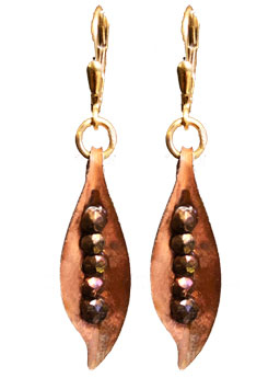 1920's irridescent copper glass accents on vintage coppery brass leaf dangles on 22K vermeil leverback earring fixtures.