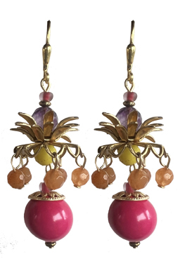 Faceted amethyst with red aventurine dangles around magenta vintage plastic drops with yellow African beads accents with brass caps with 22K vermeil leverback earring fixtures.