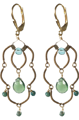 Vintage feeling, airy light earrings in African jade with aqua glass accents with lacey brass chain on 22K vermeil leverback earring fixtures.
