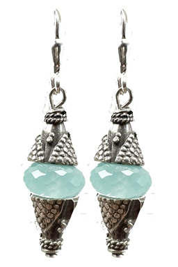 Balinese sterling silver cones around faceted chalcedony centers on sterling silver lever back earring fixtures.