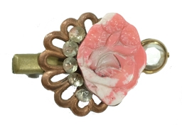 Carved pink coral of a bird on vintage brass fan accented by vintage rhinestones & faceted yellow quartz in brass ring on antiqued bronze toothed hair clip for a more subtle touch to pin up a bit of hair. 1.5" L x 1" W