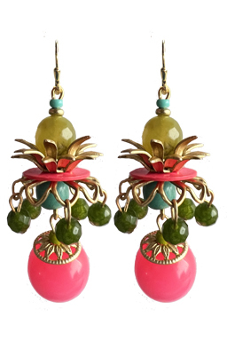 New jade faceted dangles around a vintage plastic drop with crystal beads on top and brass caps with 22K vermeil leverback earring fixtures. 2" L x 3/4" W
