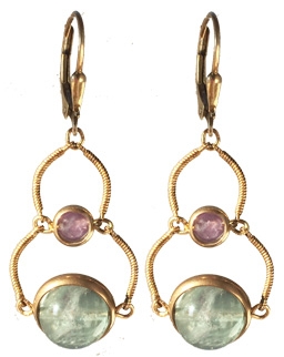 Brass filigree links with smooth flourite and faceted amethyst beads dangling from 22K vermeil lever back earring fixtures. 2"L x 1"W