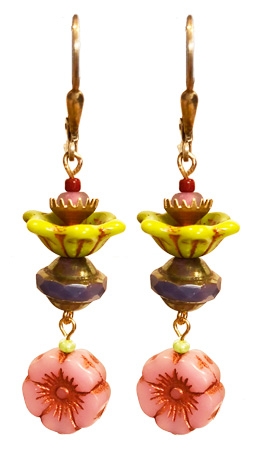 Festive everyday earring made with new glass beads in chartreuse, lavender and pink with new brass findings on 22K vermeil lever back earring fixtures. 1.75"L x .5"W