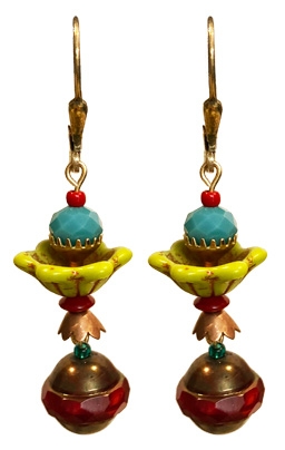 Festive everyday earring made with new glass beads in chartreuse, red and turquoise with vintage and new brass findings on 22K vermeil lever back earring fixtures. 1.75"L x .5"W