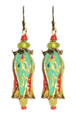 Handpainted Fabrege Egg inspired tulip drop earring with vintage and semi-precious accent beads on 22K vermeil leverback earring fixtures.  2"L x .5"W