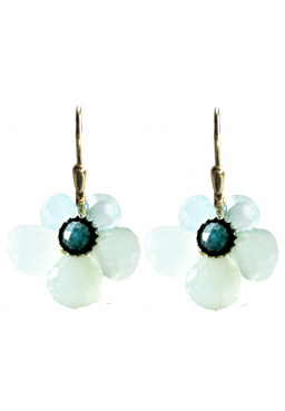 Faceted aqua chalcedony doublets make up this floral arrangement with teal apatite centers and brass findings on 22K vermeil lever back earring fixtures.