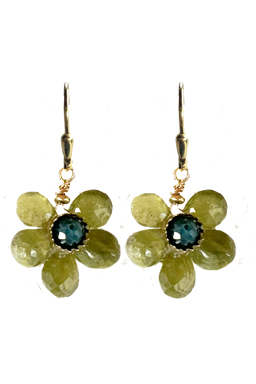 Faceted green garnet doublets make up this floral arrangement with teal  apatite centers and brass findings on 22K vermeil lever back earring fixtures.