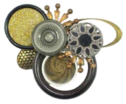 Large, mod brooch made with 1940's glass with 1960's plastic buttons, discs and hoops. 3" L x 3 1/2" W