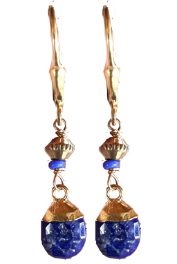 Delicate faceted lapis lazuli drops & brass rondelles with vermeil caps and leverback earring fixtures. 1"L x .3"W