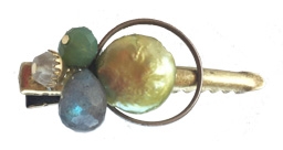 Mod arrangement of freshwater pearl disc with a green cast with faceted pyrite, new jade and green color crystal beads on a vintage brass hoop on antiqued bronze toothed hair clip to pin up a bit of hair. 1.5" L x 1" W
