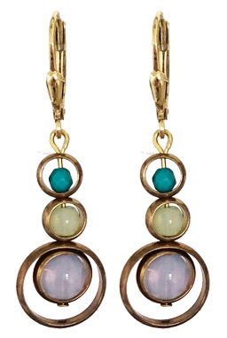 Simple mod earring with rotating rings surrounding pale milky lavender and green glass and Chinese turquoise beads on 22K vermeil lever back earring fixtures. 1.2" L x .3" W