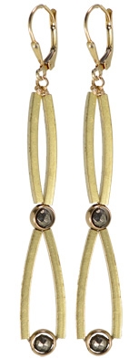 Super light weight modern deco long brass swaying with encased faceted pyrite beads in brass rings on 22K vermeil lever back earring fixtures. 2.5"L x .25W