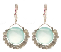 Faceted aqua chalcedony circles surrounded by faceted labradorite beads on sterling silver lever back earring fixtures. 1.5"L x 1"W
