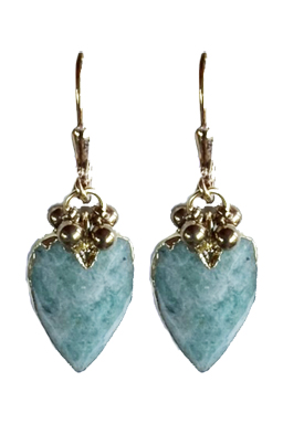 Faceted amazonite hearts surrounded by vermeil with brass ball accents on 22K vermeil lever back earring fixtures.