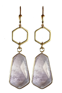 Translucent amethyst surrounded by a gold-fill frame with brass hexagon top on 22K vermeil leverback earring fixtures.