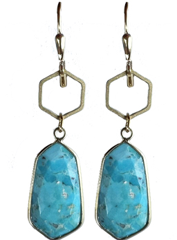 Dyed Chinese turquoise surrounded by a gold-fill frame with brass hexagon top on 22K vermeil leverback earring fixtures.