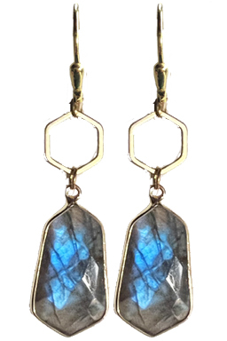Labradorite surrounded by a gold-fill frame with brass hexagon top on 22K vermeil leverback earring fixtures.