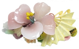 Vintage glass bonsai flowers with '50's celluloid fan and dyed hot pink new jade accents on 3.5" french barrette . 4.24"L x 2.25"W