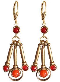 Mod, classic style with brass with faceted carnelian beads on 22K vermeil lever back earrings. 2.5"L x .5"W