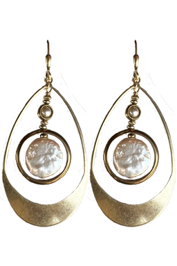 Bold and large brass hoop earring with freshwater pearls dangling and vintage faux pearl accents on 22K vermeil lever back earring fixtures.