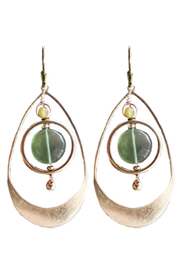 Bold and large brass hoop earring with faceted green strawberry quartz and olive jade dangle on 22K vermeil lever back earring fixtures.
