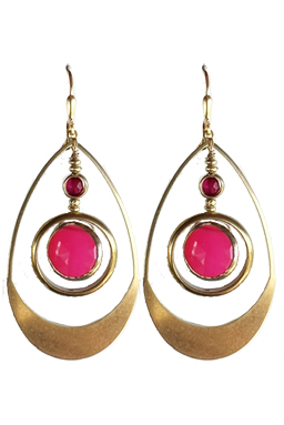 Bold and large brass hoop earring with faceted  hot pink chalcedony and fucia agate dangle on 22K vermeil lever back earring fixtures.