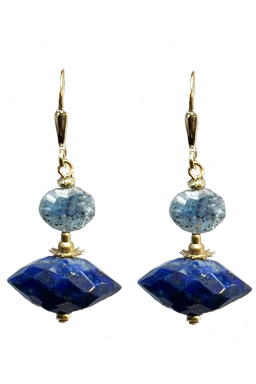 Marquis shaped lapis lazuli and apatite beads with brass findings and faceted amethyst accents on 22K vermeil lever back earring fixtures.