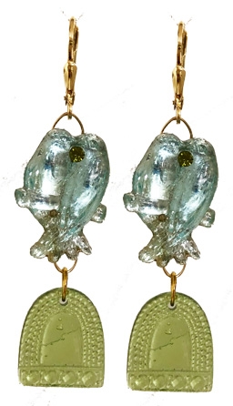 1950's turquoise glass love birds with 1920's green crystal dangles on 22K vermeil lever back earring fixtures. 1.75"L x .5"W