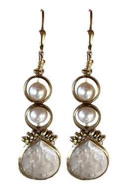 Faceted vermeil framed freshwater pearl drops with brass rings surrounding pearl on 22K vermeil lever back earring fixtures.