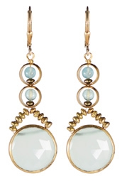 Faceted vermeil framed aqua chalcedony drops with brass rings surrounding apatite beads on 22K vermeil lever back earring fixtures. 1.75" L x .5" W