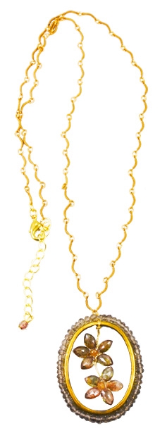 Faceted andalusite flowers with andalusite beads surrounding a brass oval frame on fancy brass chain with lobster claw closure and 2" extension. 18" + 2" pendant + 2" extender