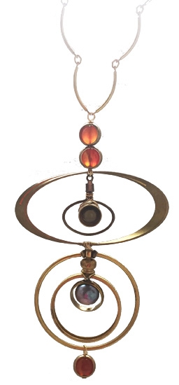 Modern, clean design with carnelian & gray freshwater pearl on vintage brass hoops and new brass chain. 30" chain with 4" pendant
