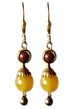Faceted brown jade with red jasper and brass findings on 22K vermeil lever back earring fixtures.
