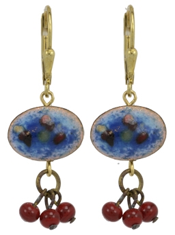 Fun little earring with 1960's enamel ovals with '50's red glass drops on 22K vermeil lever back earring backs. 3/4"L x 1/2"W