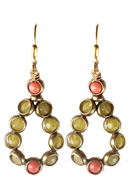 Faceted olive jade and coral glass beads encased in brass rings on 22K vermeil lever back earring fixtures.