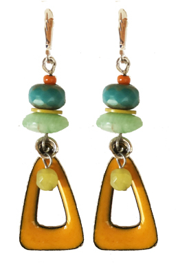 Cute, cheerful mod orange enamel drop with olive jade dangles and turquoise, orange and pale green glass accents on sterling silver lever back earring fixtures.