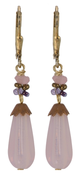 Dyed pink new jade with new glass beads, 1960's copper bead cap on 22k vermeil lever back earring wires. 1 1/2" L x 1/4" W